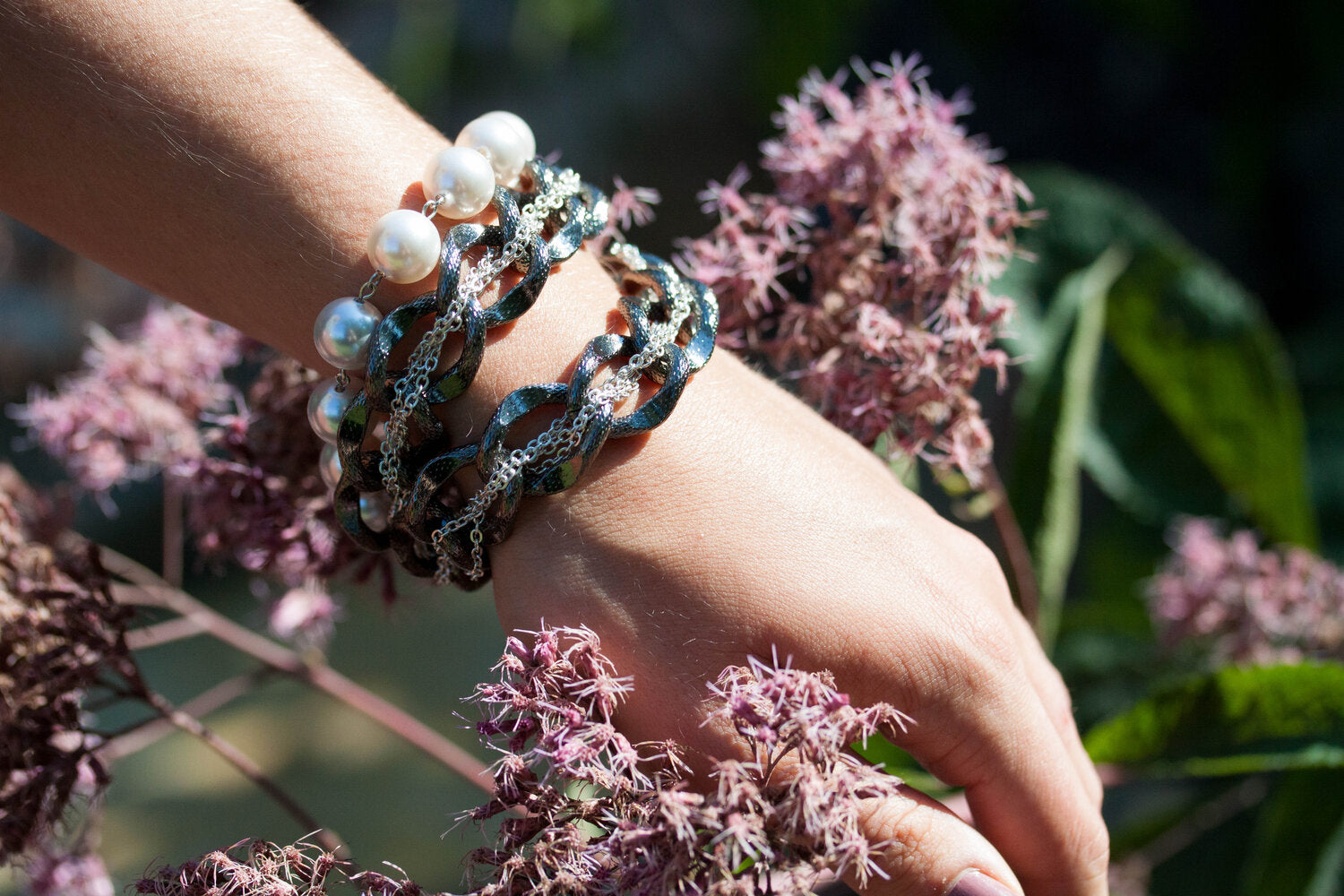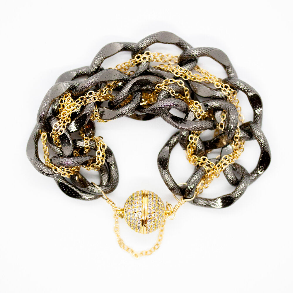 14K gold-filled or sterling silver chain intricately woven through gunmetal chain links and finished with a magnetic pavè cubic zirconia clasp with an additional safety chain and clasp.