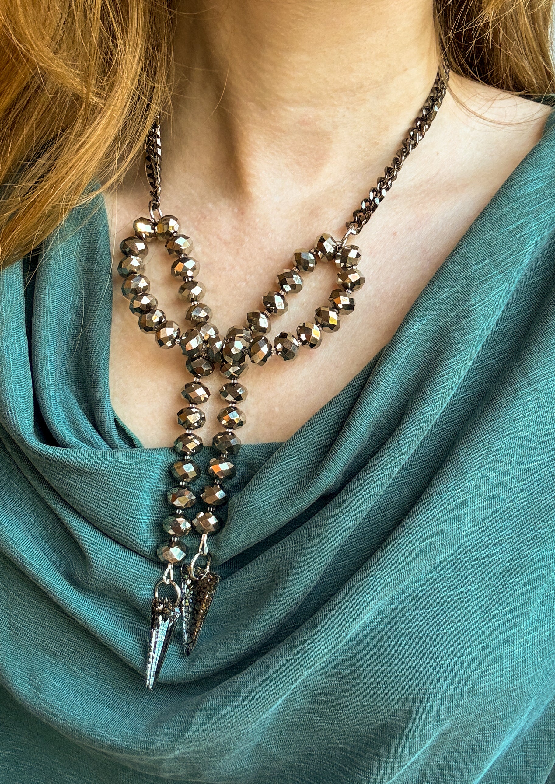The days of ties are over. Accessorize with a crystal bow necklace, featuring crystals in gold, black, and silver. The necklace chain is stainless steel with 14 karat gold plating, with Swarovski pendants hanging on the bow.