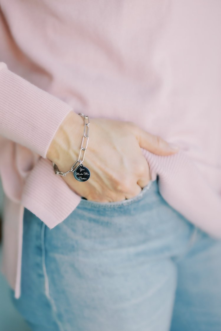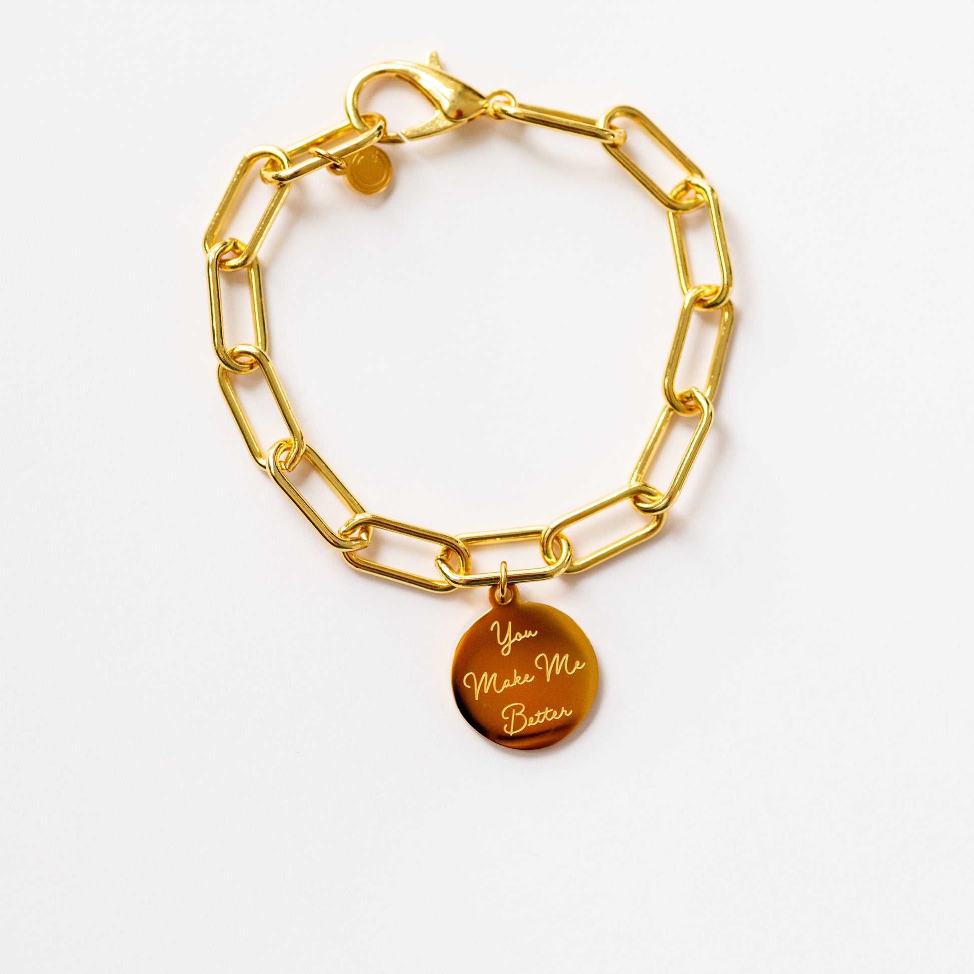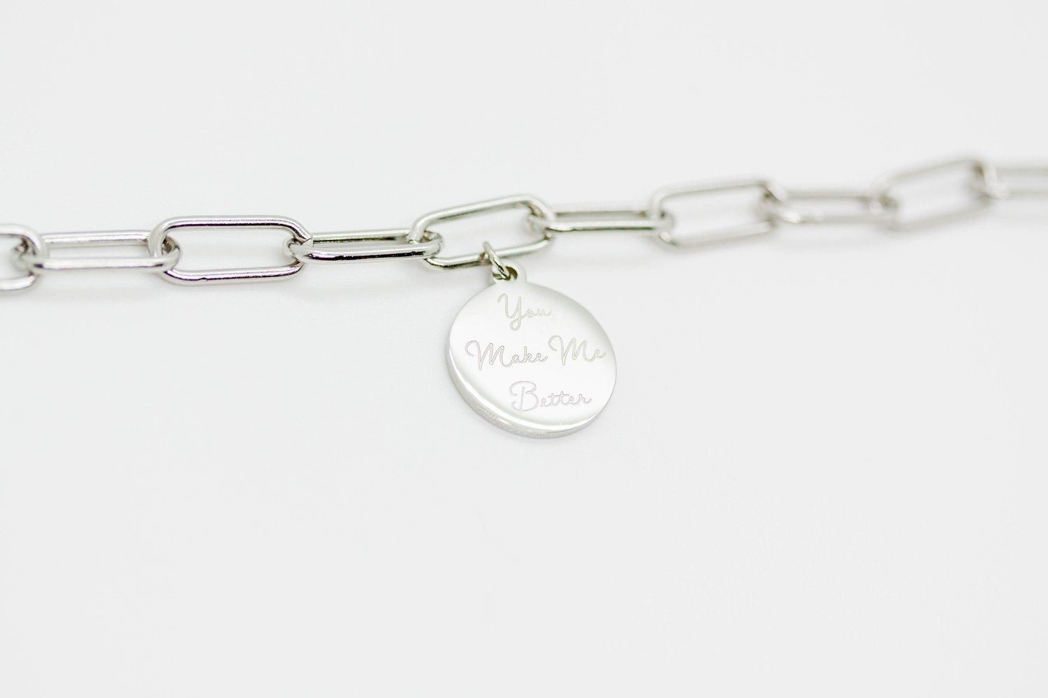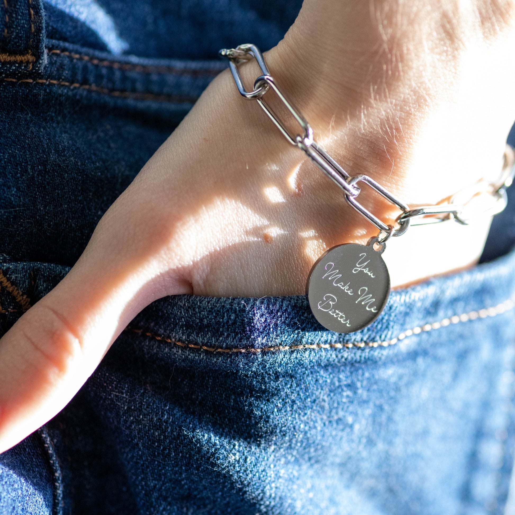 The You Make Me Better Pendant Bracelet is made of Stainless Steel and measures 7.5” length x .25” width. The chain links allow for adjustable sizing if you would like to make it fit snugger.