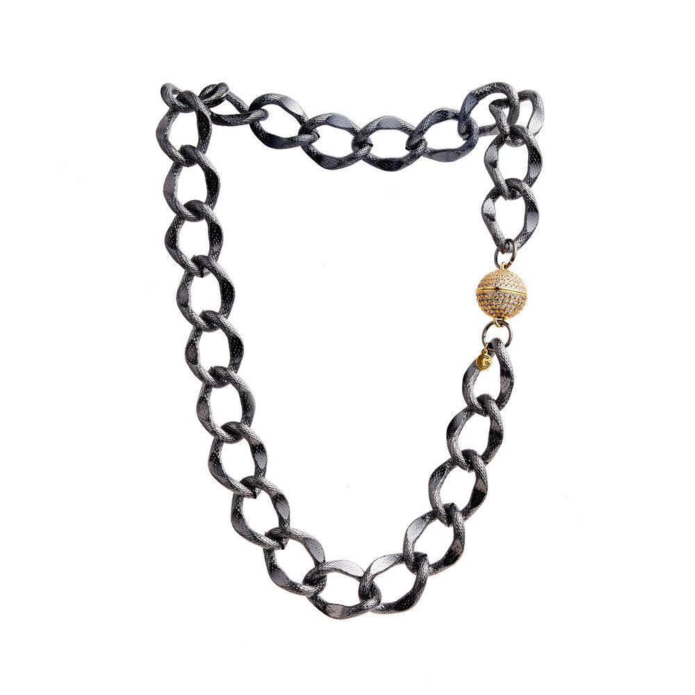 Introducing the Jane Necklace - a bold, classy, and versatile piece that will elevate any outfit. The steel gunmetal chain links are attached to the Goldfine Jewelry Signature CZ Magnetic Clasp, available in gold, and silver clasps. The pavè clasps are 14k gold-plated or sterling silver plating with cubic zirconia.