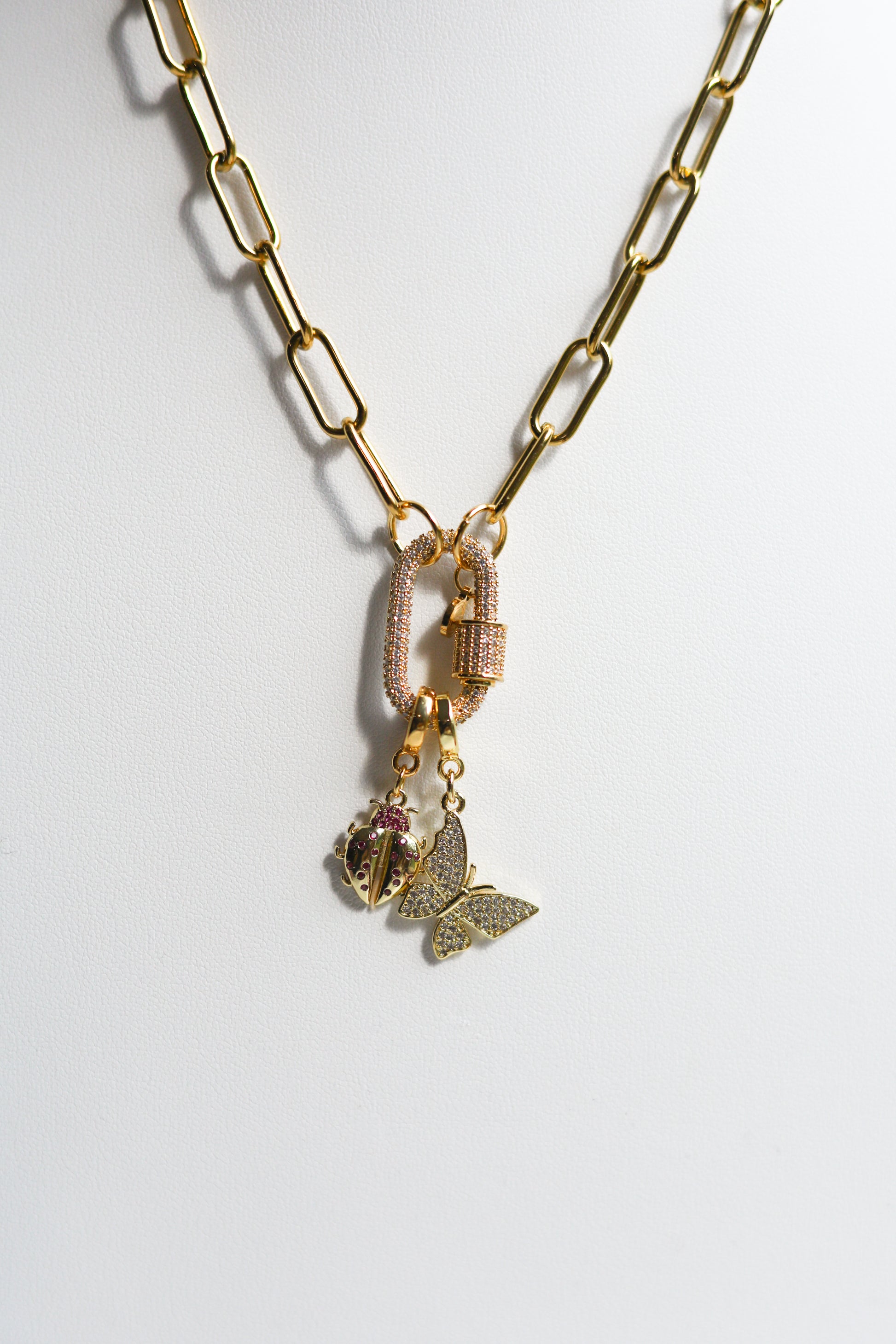 Part of our Lock Charm Collection for The Build Your Own Jewelry Bar, the Large Butterfly Lock Charm is a gold-plated charm featuring a flat butterfly design, delicately inset with pavé stones. Attached at the tip of its wing, this charm appears as if it is about to take flight, symbolizing transformation, growth, freedom, and new beginnings.