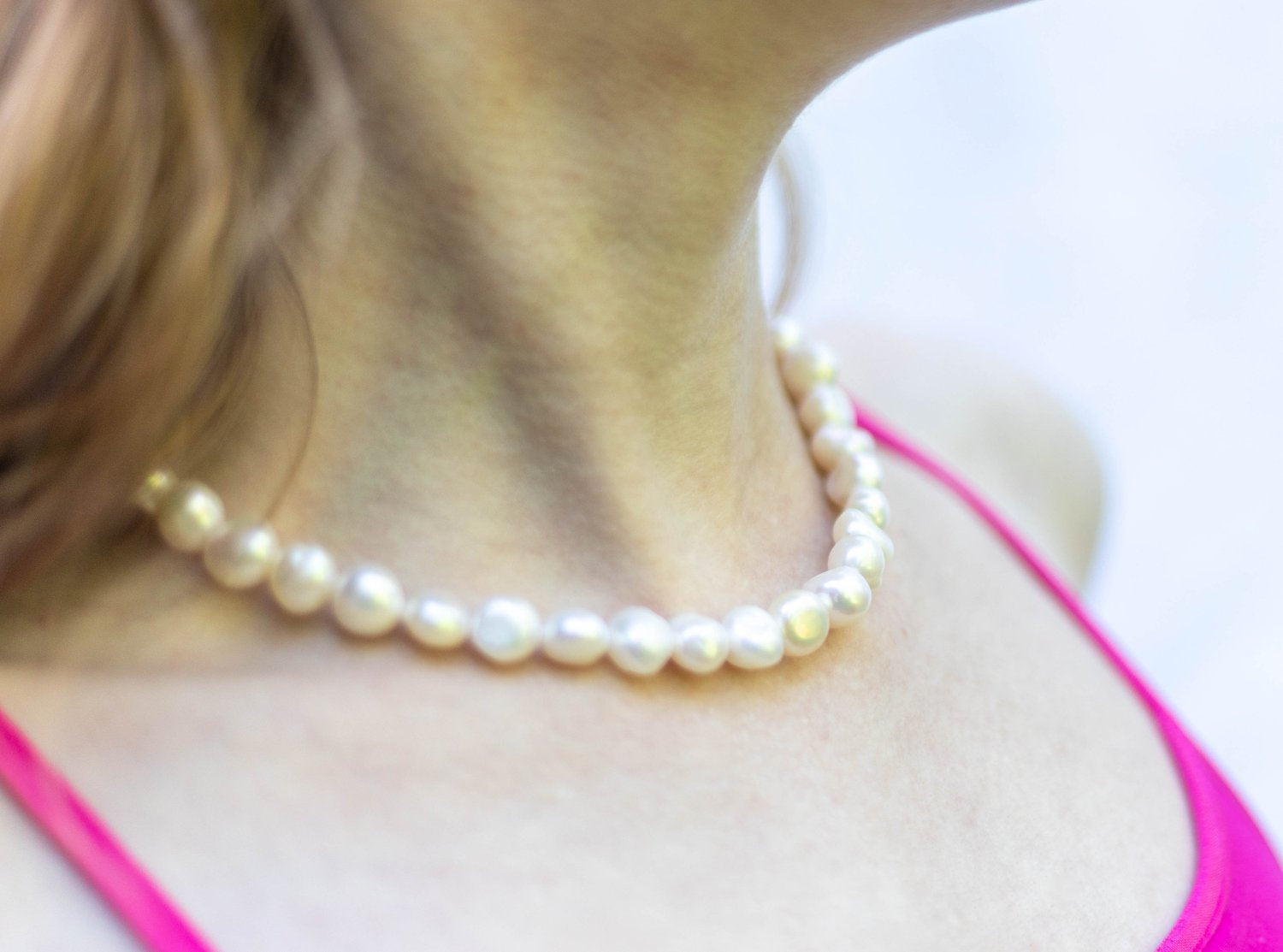 Measuring 15.75” - 17.5” in length, this necklace features 8mm x 7mm pearls. For those in need of custom sizing, simply message us with your order number and we'll be happy to accommodate your request.