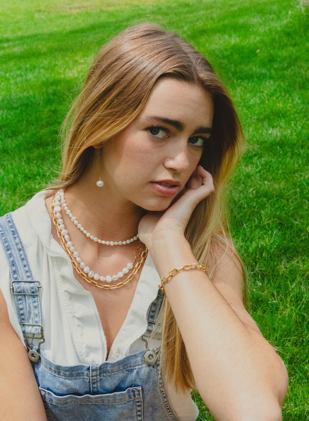 For the ultimate boho chic look, pair the Santa Barbara Pearl Necklace with the smaller pearls in the Kokomo choker, as seen on model Siri Olsen. Wear them layered or attach them together!