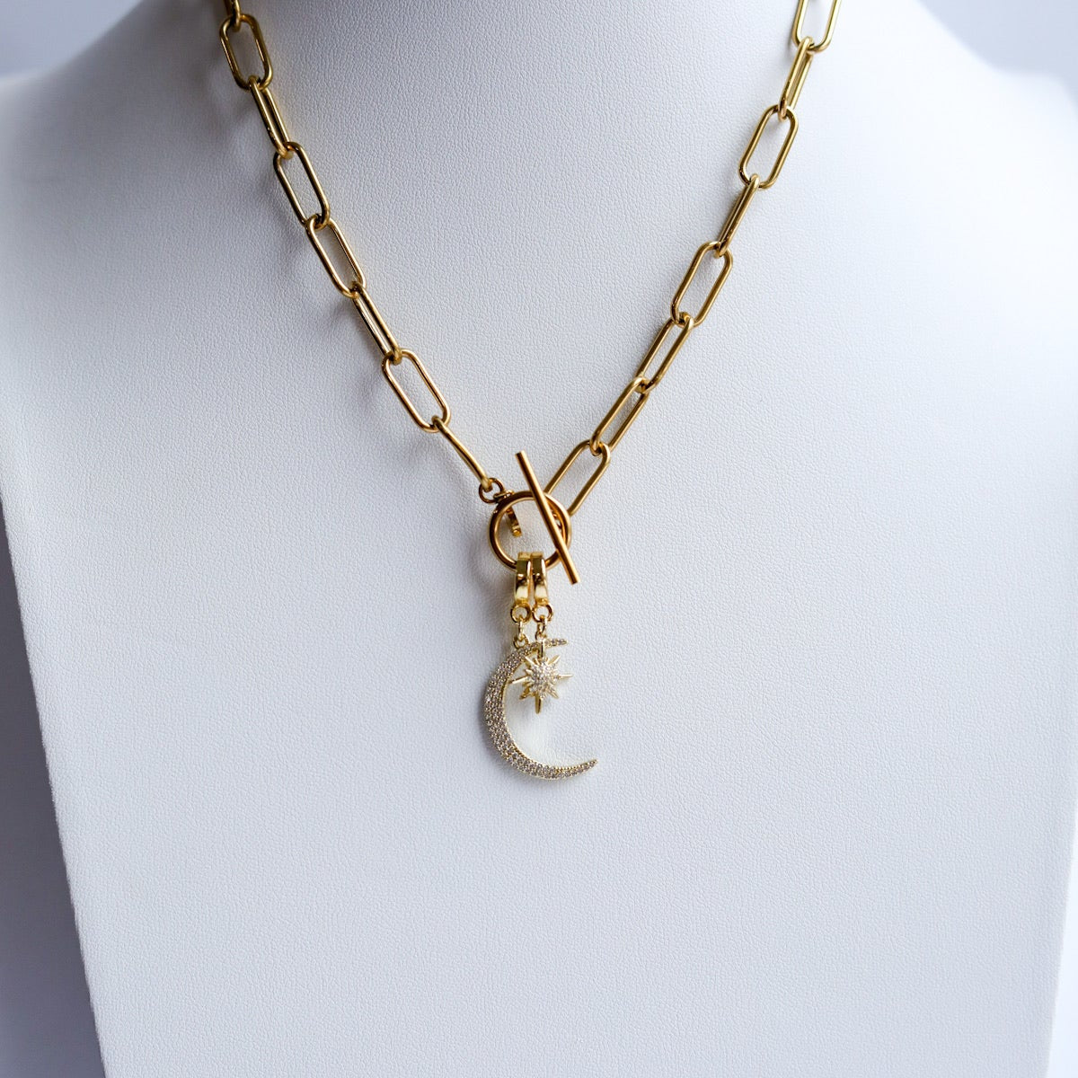 This ready-to-gift necklace comes with 2 lock charms, and our classic small toggle necklace. Our two featured charms are our large moon lock charm and sun lock charm, both encrusted with sparkly CZ stones. These charms together represent the duality and cycle of life, unity, and balance.
