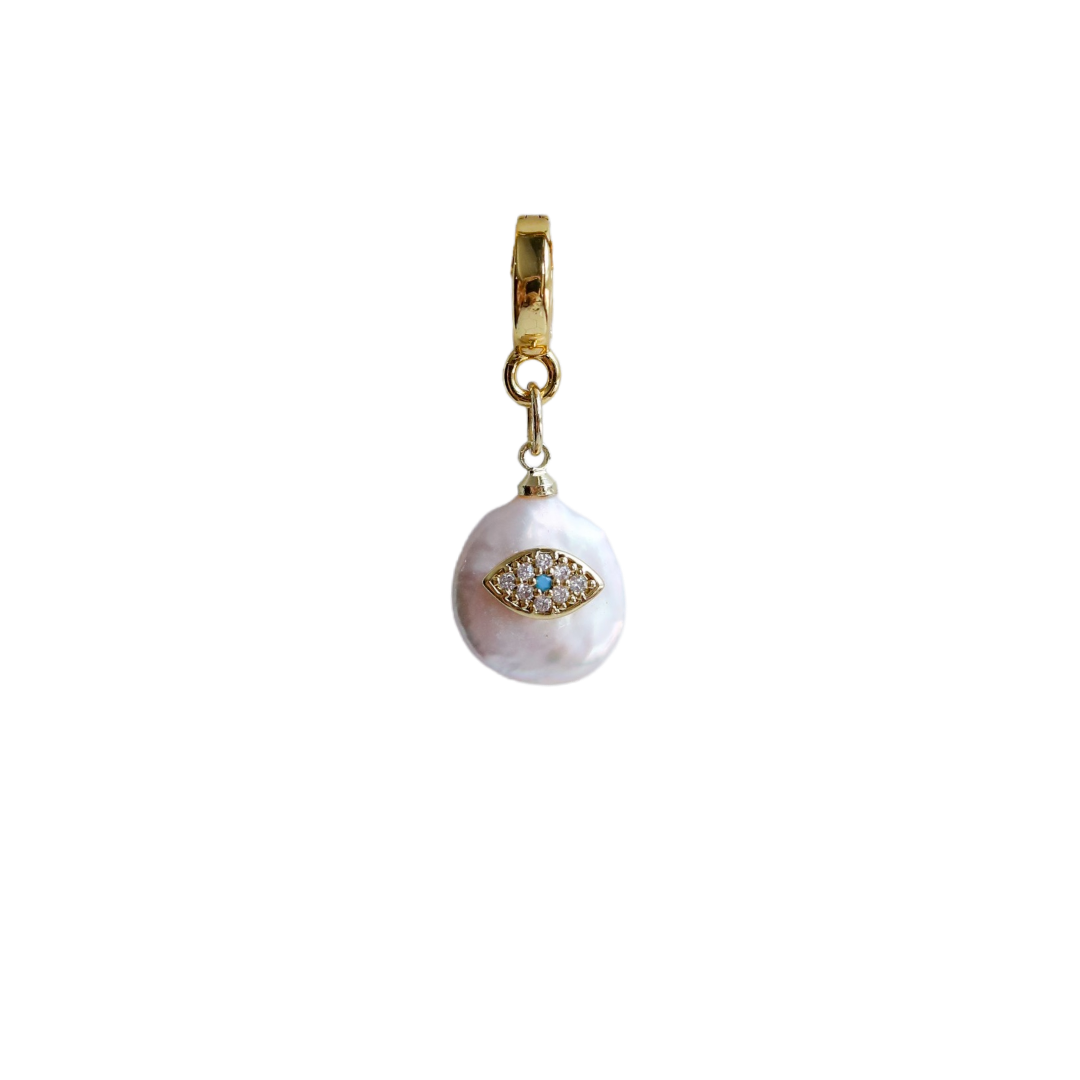 Our favorite combination, pearls and evil eyes! This charm is perfect for protection and for upping your sophistication with a beautiful pearl. Please note, that each freshwater pearl is unique and will not be in the exact shape as the one in our listing.